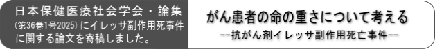 を単なるお題目としないために、私たちはイレッサによる悲惨な被害を再び思い起こし教訓としていただきたいとの願いをこめて、「癌患者の命の重さを問う」活動を行って参ります。 |